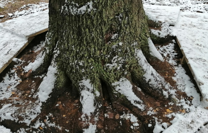 После мы заглянем к 180-летней ели высотой целых 35 метров. Даже у двух взрослых мужчин не получится её обнять.