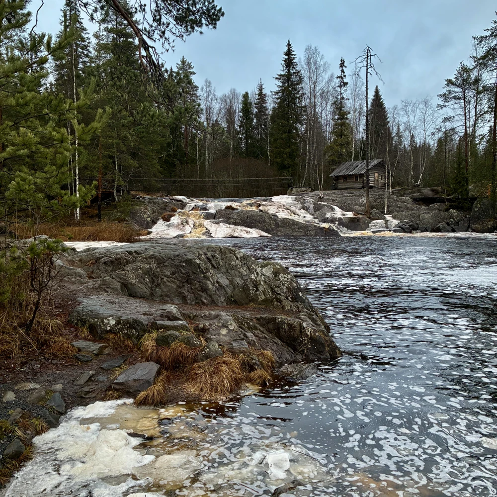 По его совету мы свернули с дороги и заехали в несколько потрясающих мест с водопадами. Не те, что на всех постерах, а те, до которых нужно немного пройти по лесной тропе. Слушать их шум и чувствовать прохладные брызги — это был особый, живой разговор с природой Карелии, её дикой и могучей стороной. Далее мы постояли на берегу безлюдного Ладожского озера — в тех местах, куда не возят большие группы. Эти моменты тишины и уюта стали такой же важной частью дня, как и величественный мраморный каньон.