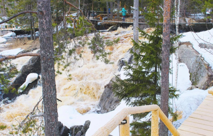 Мы остановимся у Тохминских водопадов, известных как Рускеальские. Вы побываете на месте съемок советского фильма «А зори здесь тихие…», а все желающие смогут прогуляться по экотропе с подвесными мостиками.