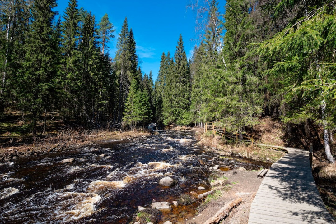 «Долина водопадов» лежит в 60 км к северу от Приозёрска. Природный ландшафт эко-парка подходит для несложного треккинга людям любого возраста и физической подготовки. Тропа с деревянными настилами, ступеньками, мостиками проведёт вас вдоль бурлящей реки Иййоки к смотровым площадкам, где стремительные потоки воды падают вниз с уступов. Высота водопадов незначительная, но они очень живописны, а прелесть карельских пейзажей дополняет картину и доставляет огромное удовольствие. На одном из водопадов стоит старинная водяная мельница — точно такая же работала на этом месте 100 лет назад.