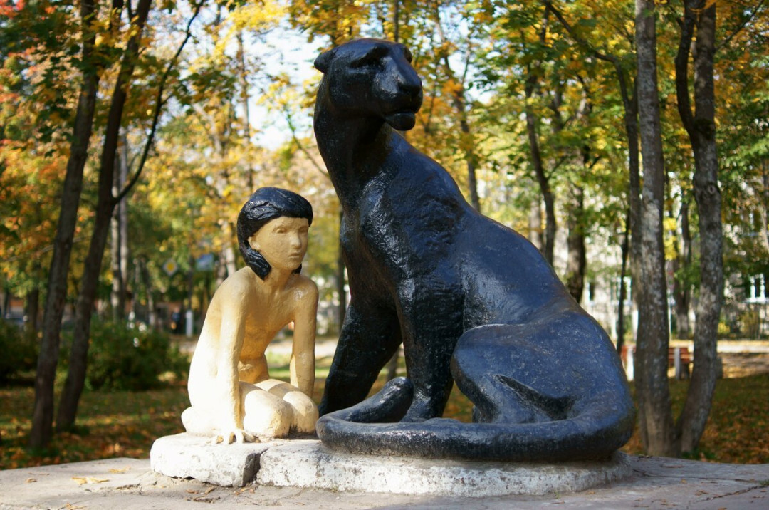 Памятник Маугли находится в Петровском сквере, недалеко от Центральной площади. Любимый с детства персонаж Киплинга в окружении лип и клёнов застыл на постаменте рядом с Багирой. Чёрная пантера почуяла опасность, напряглась и тревожно глядит вдаль. Напружинился и маленький Маугли — он готов к любому действию по знаку своего верного друга. Ступеньки на постаменте дают возможность зрителям подобраться поближе к сказочным героям, сфотографироваться с ними и выразить свою признательность. Скульптура появилась в Приозёрске в 1967 году, это одна из первых работ начинающего скульптора Б. Карагода. Памятник Маугли полюбился жителям и гостям северного города.