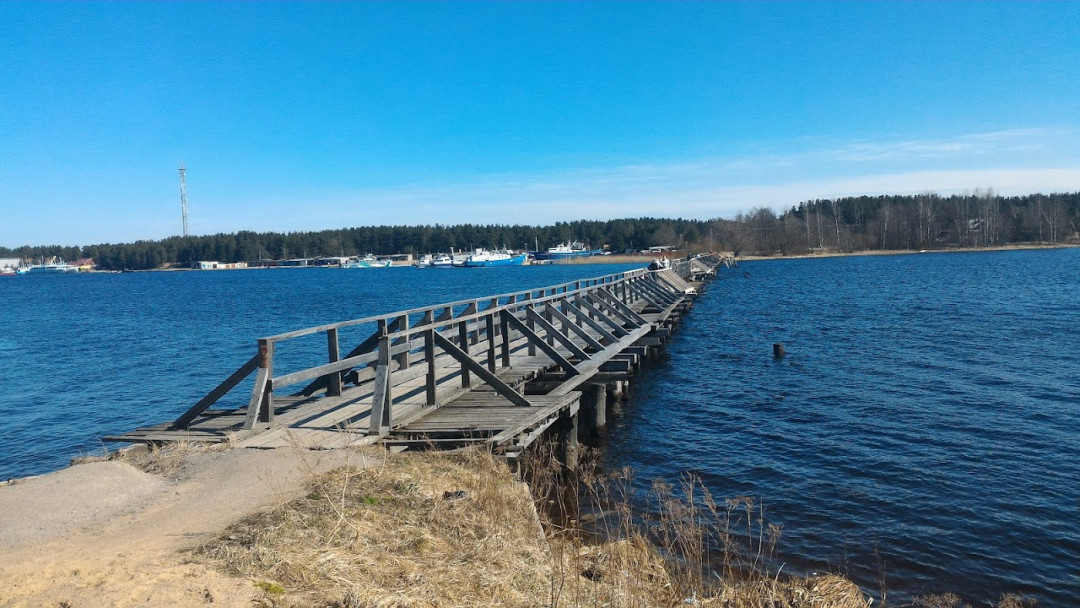 Деревянный пешеходный мост через Вуоксу появился в Приозёрске в 1916 году. Мост наплавной, с пролётами, опирающимися на воду — деревянный настил плавно качается в такт шагам пешеходов. Одна из створок моста при необходимости может подниматься, чтобы пропустить водный транспорт. В народе мост называют Бумовским — до 1986 поблизости работал целлюлозно-бумажный комбинат. Деревянные опоры моста отслужили уже три проектных срока — на его месте планируется построить типовую автомобильную магистраль. А пока ежегодно ремонтируют несколько пролётов, чтобы пешеходы могли безопасно пройтись по старинному сооружению, полюбоваться окружающей панорамой. Окрестные леса по обе стороны моста богаты ягодами и грибами, популярны эти места и среди рыболовов.