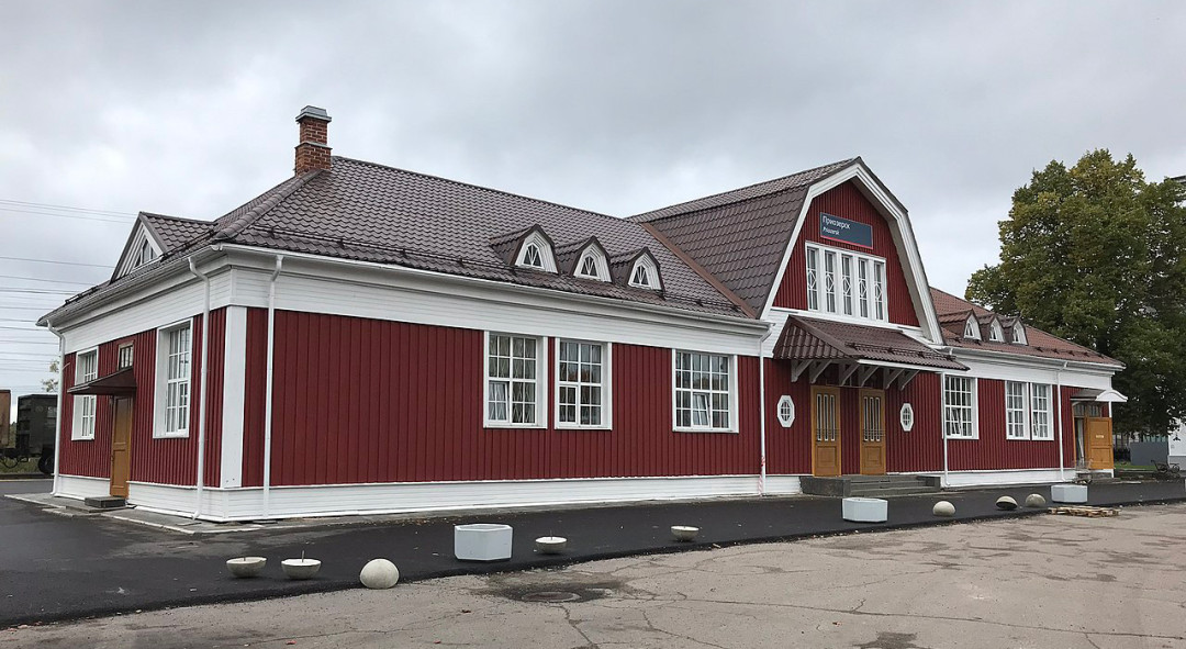 Если вы приехали в Приозёрск по железной дороге, обратите внимание на здание вокзала — удивительный памятник истории и архитектуры. Он был построен в 1916 году, когда город назывался Кексгольмом и входил в состав автономного княжества Финляндского под управлением Российского императора. Вокзал спроектирован финскими архитекторами в стиле «северного модерна», сочетающего классические формы с элементами национальной архитектуры. В традициях финского зодчества здание вокзала выполнено из дерева и крыто черепицей. Фасад венчает щипцовый фронтон. Удивительный факт — в 1941 году все деревянные строения в городе выгорели дотла, невредимым осталось лишь здание вокзала, которое благополучно дожило до наших дней. В 2009 году во время капитального ремонта был восстановлен аутентичный облик провинциальной финской станции начала XX века. Панели и потолок внутри здания отделаны деревом, сохранились восьмиугольные окошки и витражные решётки на оконных проёмах, помещение освещается старинными люстрами. Лишь красный цвет стен снаружи отличается от типового цвета финских вокзалов — их было принято красить в серо-жёлтые тона.