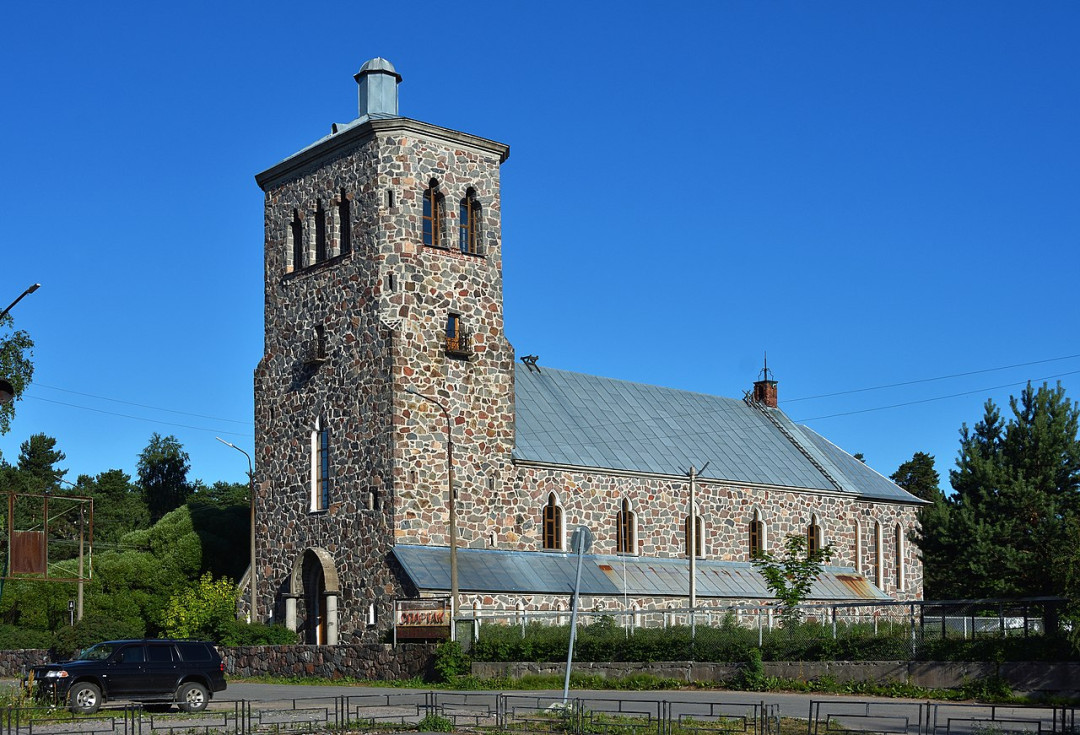 В 1918-1940 годах Приозёрск назывался Кякисалми и входил в состав Независимой Финляндии. Здесь в 1930 году была построена монументальная лютеранская кирха — творение архитектора А. Линдгрена. Кирха выдержана в стиле северного модерна, в нём скандинавские художники стремились выразить национальный характер, опираясь на традиции своего народа. Т-образный массивный храм сложен из валунов, добытых со дна Ладожского озера. Причудливые оконные проёмы в стенах похожи на бойницы средневековой крепости. Силуэт строения напоминает северные скальные ландшафты, среди которых формируется суровый нордический характер.