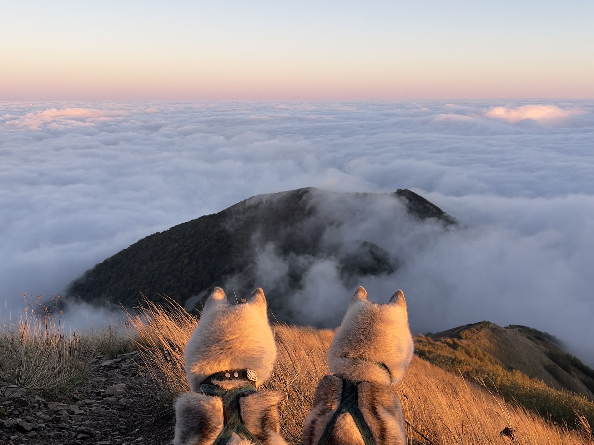 Если у вас слабые ноги - не ходите. Это не прогулка, а реальное восхождение по крутой (а у нас еще и скользкой, грязной) горе. Набор высоты 600 м. Спускаться тяжелее, чем подниматься. Выезд в 3:20 ночи. Идете вверх в темноте с налобным фонариком. Наверху оочень сильный ветер. Одежда и обувь вся в грязи. Но! Все это мелочи по сравнению с чувствами и эмоциями, которые вы получите, встречая рассвет в компании таких же сумасшедших людей и двух пушистых компаньонов на высоте 1400 м. Спасибо Артему и его коллеге Николаю. Было реально круто!