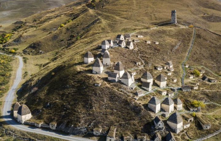 «Город мёртвых» селения Даргавс – место красивое и слегка жутковатое. Сотня каменных башенок с округлыми крышами стоят на продуваемом ветрами горном склоне. Каждый «домик» – фамильная усыпальница. Людей хоронили вместе с усопшими ранее родственниками, размещая на полках или в деревянных колодах. Некрополь пополнялся на протяжении пятисот лет: с XIV до XIX века. Даргавс – непростое в эмоциональном восприятии место. Memento mori – «Помни о смерти». Это сказали европейские монахи, но аланские горцы их бы поняли. На стене одной из усыпальниц написано: «С любовью смотрите на нас. Мы были такие, как вы, вы будете такие, как мы».