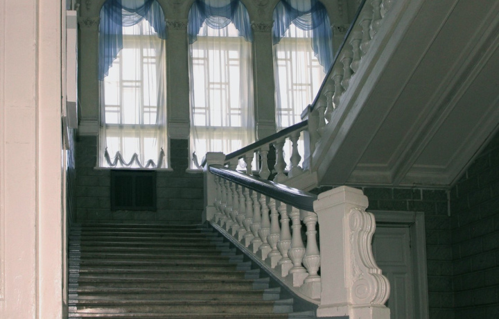 - По дубовому паркету огромных гимназических коридоров мы пройдём в просторный актовый зал
