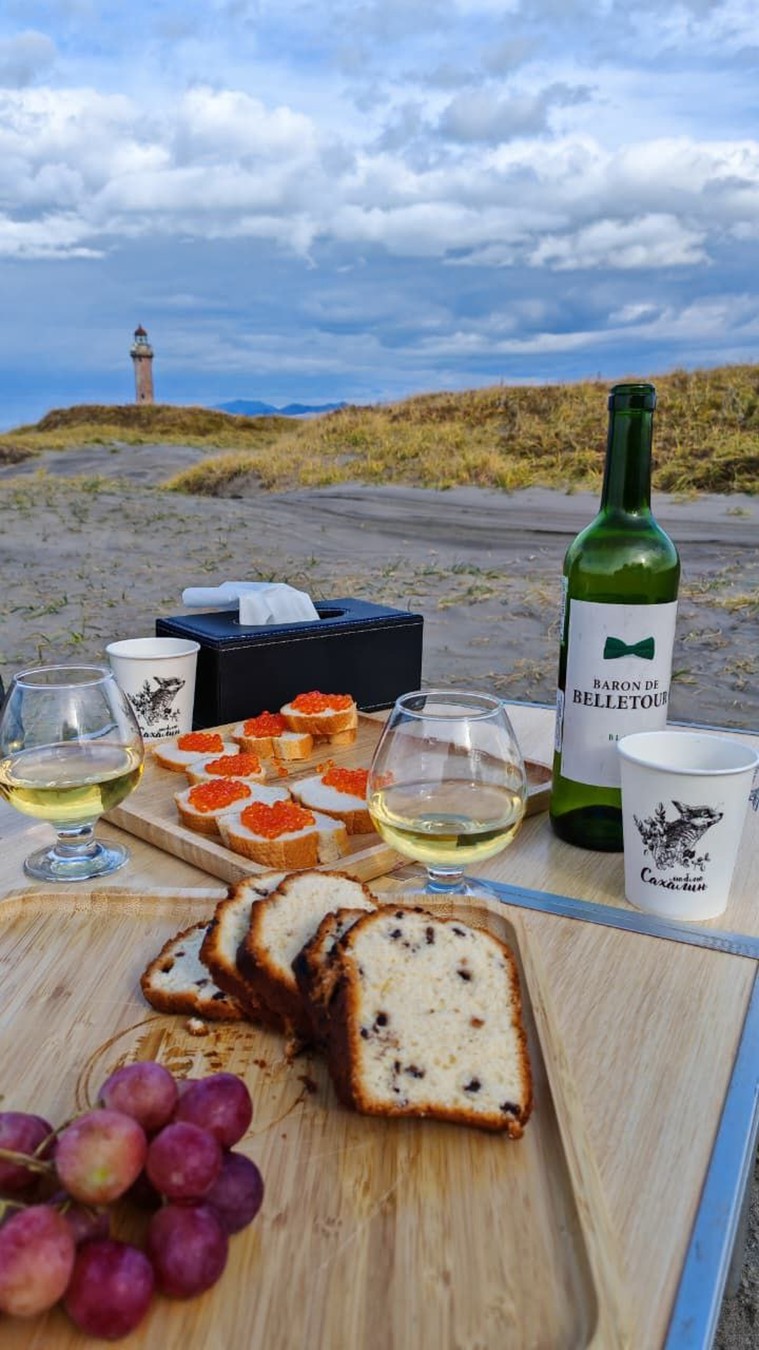 Отдельный респект нашему гиду! Анатолий превратил дорогу к мысу в полноценное приключение. Мы посетили Холмск и Невельск, увидели знаменитый севший на мель сухогруз и узнали историю этих мест. В том числе и историю маяка. Приятным пунктом программы стал пикник с местными угощениями (красной икрой) на фоне шикарного вида - организованный с особой заботой и вниманием к деталям.