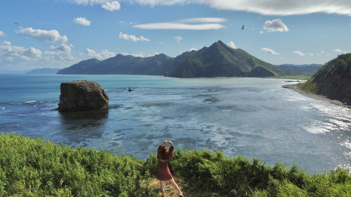 Бухта Тихая и виды на хребет Жданко и пик Смелый. Вас окружат впечатляющие, истинно сахалинские ландшафты: отвесные берега, срывающиеся в море скалы, кекуры фантастических форм и снующие повсюду чайки. Здесь можно замедлиться, отдохнуть на побережье и почувствовать атмосферу одной из самых красивых бухт острова.