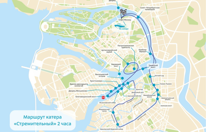 🚤 На симпатичном и ярком катере мы пройдём по Большой Невке, парадной Неве, Кронверкскому каналу и другим водным артериям города: р. Фонтанка, Крюков канал, р. Мойка, Зимняя канавка.