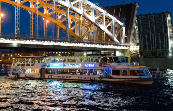 На борту нашего двухпалубного теплохода вы сможете не только любоваться видами, но и слушать живую музыку — мерцающий в темноте Петербург под звуки джаза особенно прекрасен. Также во время круиза будет работать ресторан, при желании вы отведаете блюда авторской кухни. Разводные мосты, живописные набережные, музыка и вкусная еда — ночь будет приятной!
