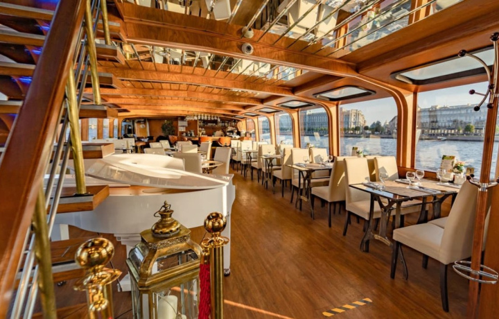 На борту нашего двухпалубного теплохода вы сможете не только любоваться видами, но и слушать живую музыку — мерцающий в темноте Петербург под звуки джаза особенно прекрасен. Также во время круиза будет работать ресторан, при желании вы отведаете блюда авторской кухни. Разводные мосты, живописные набережные, музыка и вкусная еда — ночь будет приятной!