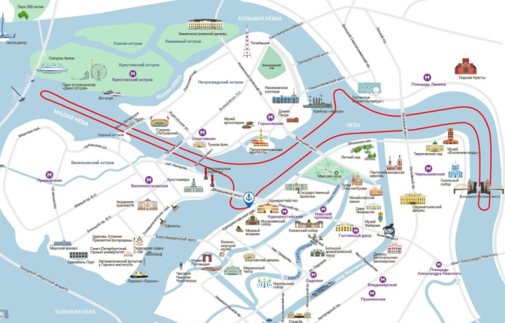 Мосты, которые вы увидите: Благовещенский, Дворцовый, Троицкий, Сампсониевский, Литейный, Большеохтинский, Биржевой, Тучков, Бетанкура.