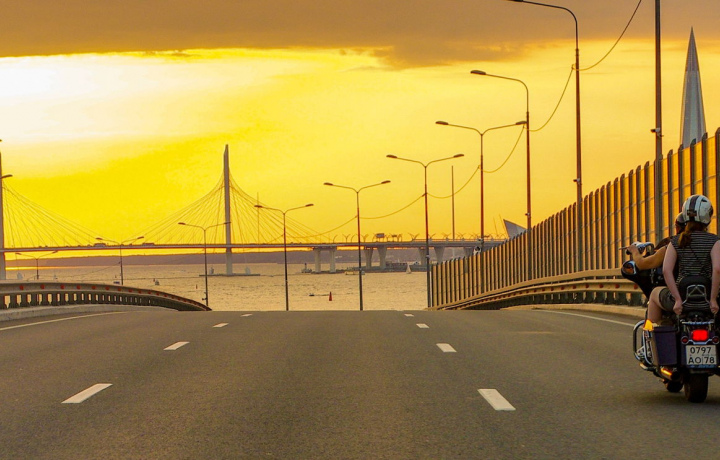 Мы поедем по очень красивой дороге: вдоль знаменитых островов Петербурга — Каменного и Елагина — и мимо башни «Лахта-центра» высотой 462 м. Далее проедем по гребню дамбы, где проложена шестиполосная магистраль, пересечём Финский залив и окажемся на южном берегу.