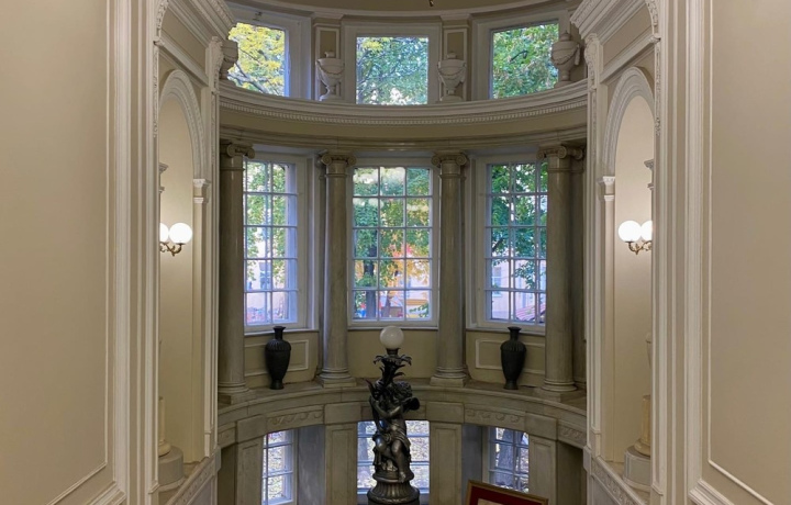 Вас встретит парадная лестница с интересным рисунком перил. Осмотрев её, вы пройдёте в четыре дворцовых зала, которые открыты для посетителей: