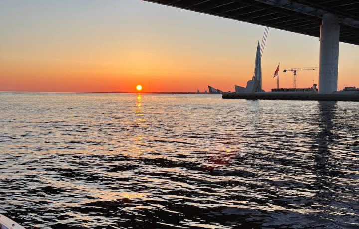 Во время захода солнца, когда небо озаряется яркими красками, Петербург наполняется особой атмосферой романтики и спокойствия, особенно если оказаться в этот момент на борту теплохода в Финском заливе.