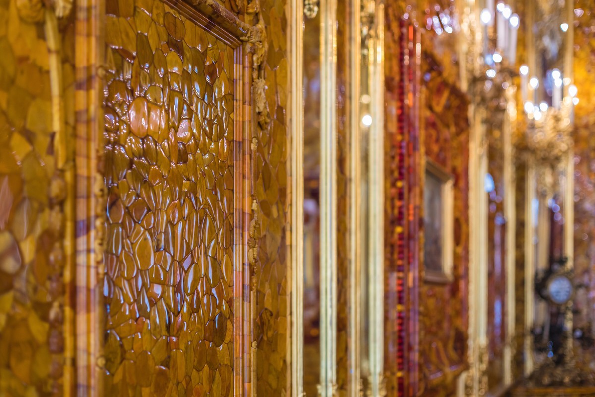 - Янтарная комната — «восьмое чудо света». Восстановлена по оригинальным чертежам и эскизам после утраты. Здесь вас ждут панели из янтаря, мозаичные композиции и рельефные украшения, картинный зал — собрание европейской живописи, Малиновая и Зелёная столбовые — образцы интерьера 18 века с текстильным декором