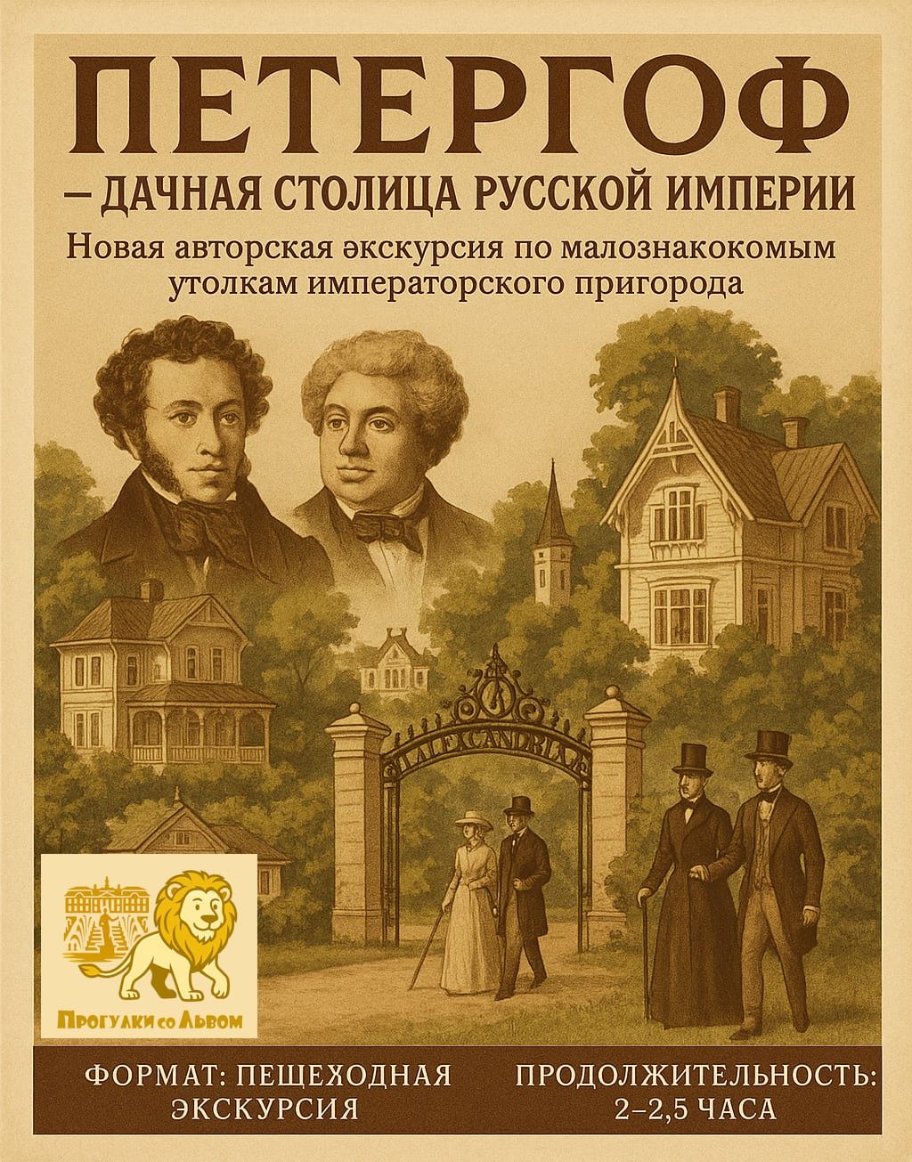 Петергоф известен всему миру своими дворцами и фонтанами, но вокруг императорских резиденций селилась также вся русская элита: богатейшие вельможи, незаконно рождённые дети царей, классики нашей литературы, художники, академики, блистательные музыканты, балерины и эксцентричные генералы. Эта экскурсия будет интересна для тех, кто уже побывал на фонтанах и увидел парадный и пышный Петергоф.