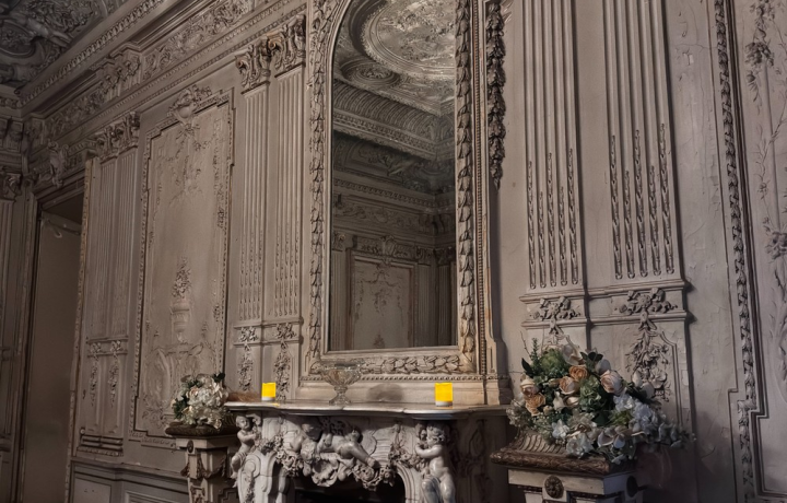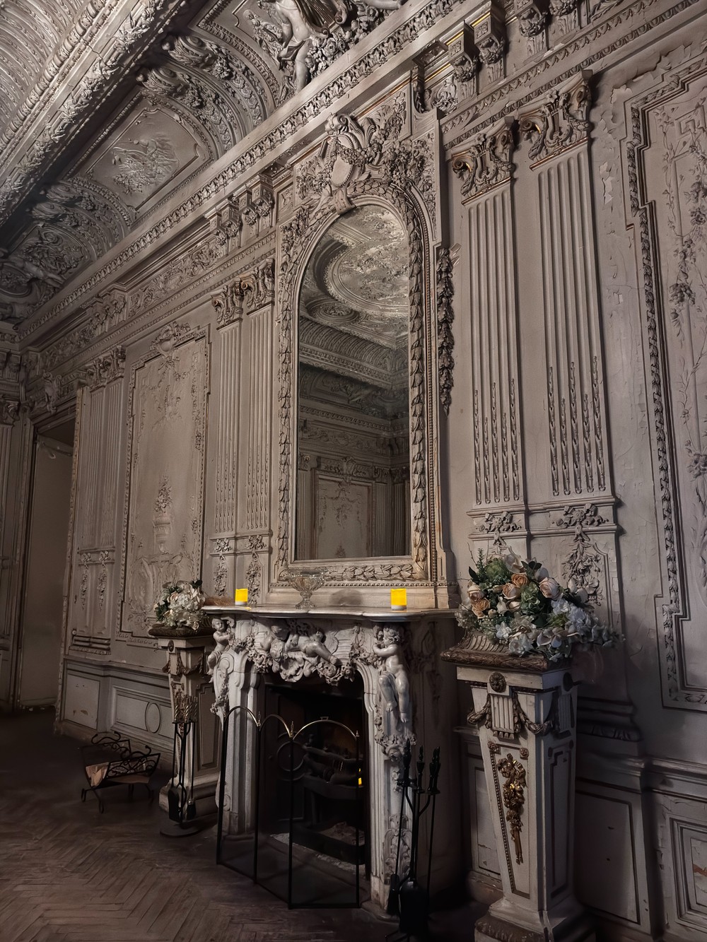 - Белый зал в стиле Людовика XV с камином, на котором стоят целующиеся путти — символы любви и гармонии