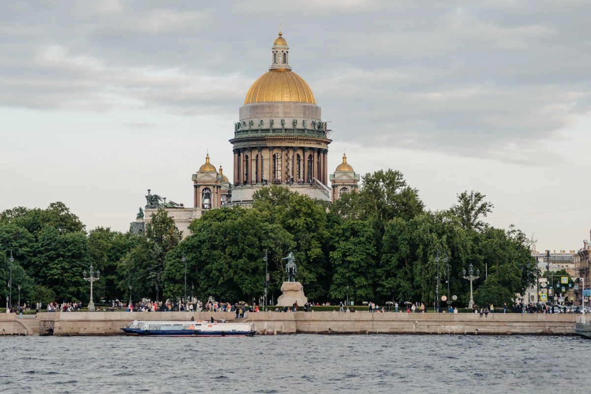 Знаменитый памятник Петру I, возвышающийся над Невой. Рядом — Исаакиевский собор и Александровский сад.
