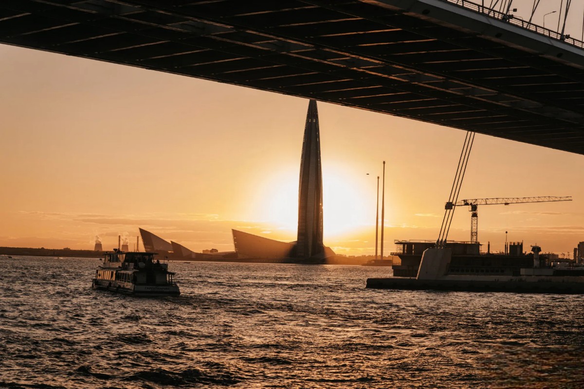 Теплоход выйдет в сторону залива, где открываются более широкие панорамы и виден современный силуэт города, включая Лахта-центр.