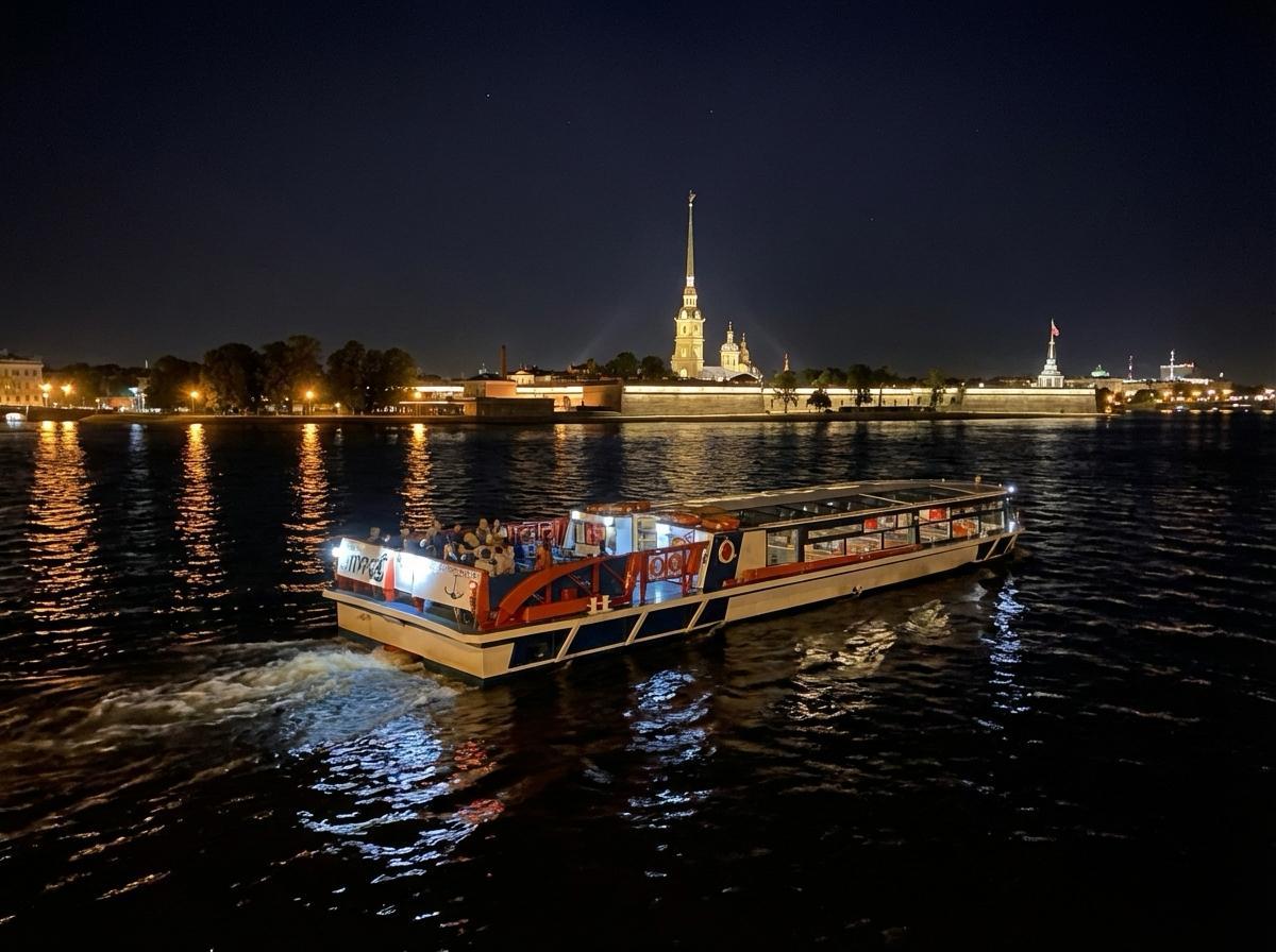 в Неву и заранее занимает позицию в акватории, чтобы вы находились в первом ряду и видели фейерверк полностью, без ограничений по обзору. Открытая палуба, огни города, фоновая музыка и салют над водой — это один из самых сильных визуальных моментов, который можно увидеть в Петербурге.