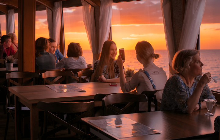Добро пожаловать на борт теплохода. Мы отправляемся на ночную прогулку по центру Петербурга. На борту теплохода есть все для приятного отдыха — живая музыка, кухня и бар.