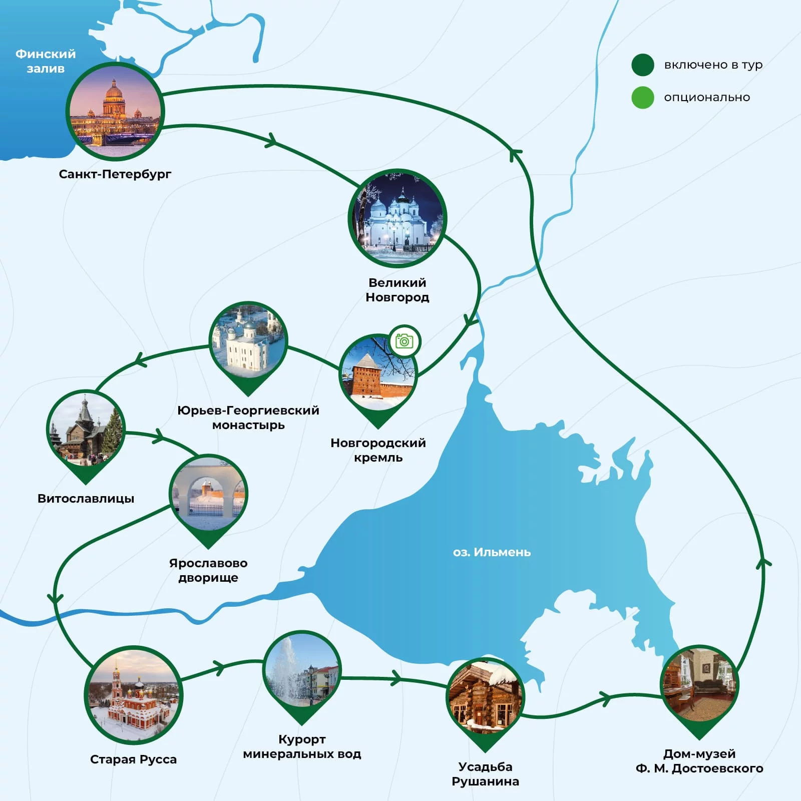 В целом тур неплохой, благодаря местным экскурсоводам и интерактивным программам. Сопровождающий гид мало давал времени на осмотр и постоянно торопил. Информацию, которую рассказывал по дороге было неинтересно слушать…все что запомнилось какие плохие дороги в Твери и какие хорошие в Новгороде, как сильно разлились реки… ну это не серьезно! Хотелось бы больше исторических фактов, увлекательных рассказов и более внимательного отношения тк , несколько раз водитель и гид повышали голос на туристов. В остальном проблем не возникло.