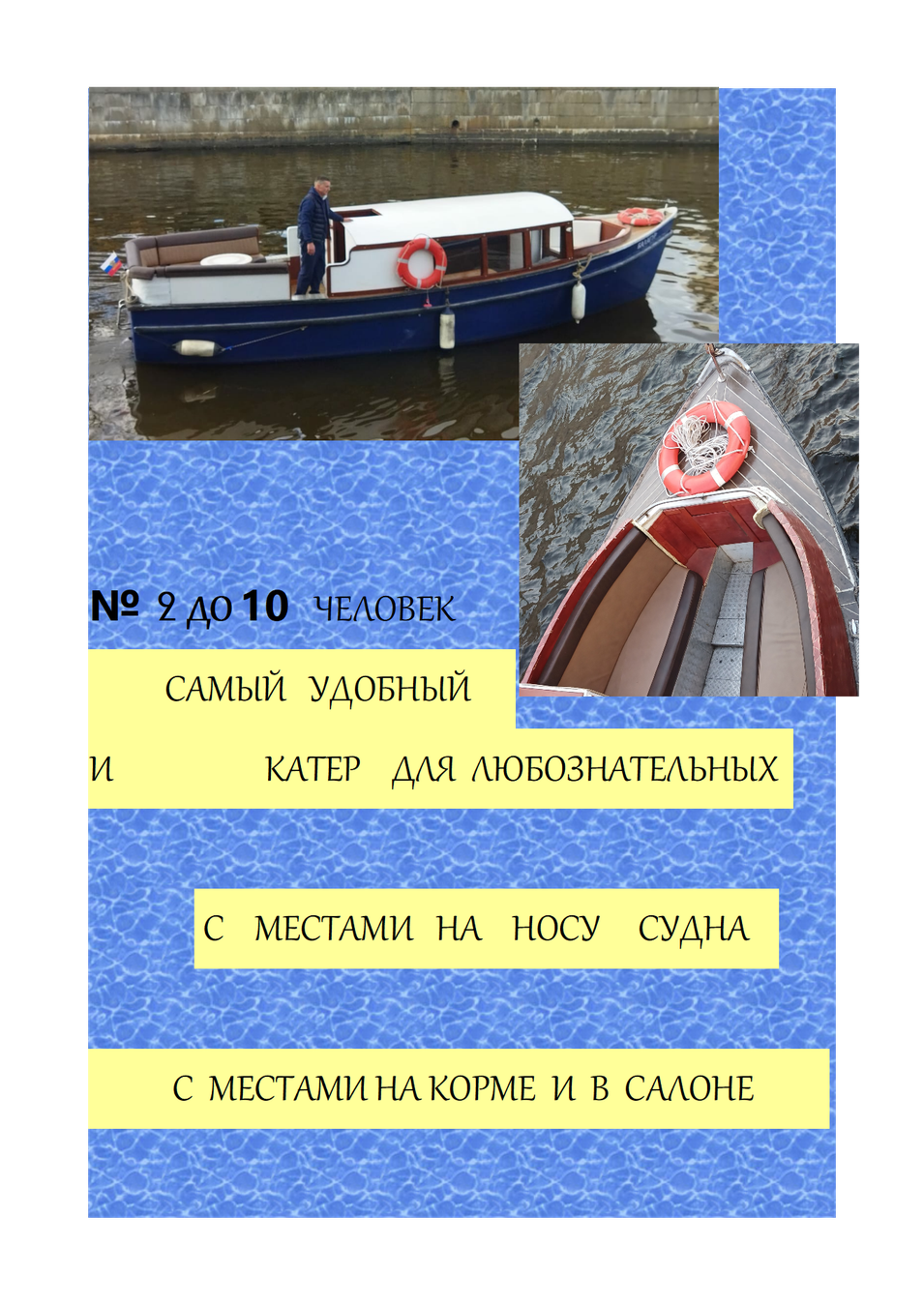 На гербе Санкт-Петербурга неслучайно изображены два скрещенных якоря: история и облик города неотделимы от водной стихии. Разместившись на уютном катере, теплоходе или яхте только своей компанией, вы пройдёте по рекам и каналам, любуясь дворцами, садами и набережными Северной столицы. А я дополню открыточные виды Петербурга городскими историями, легендами и байками.