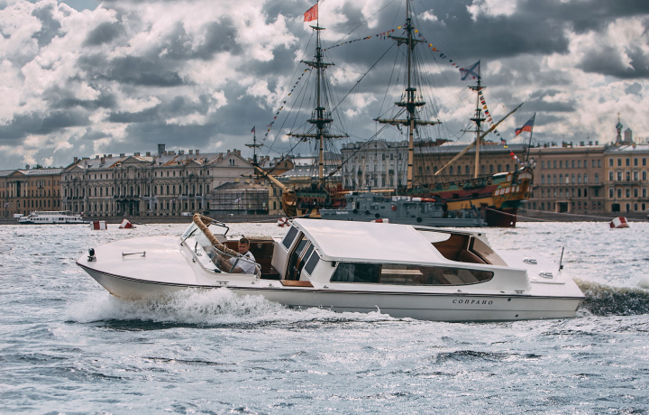 Панорамные окна открывают широкий обзор, а раздвижная крыша как на кабриолете дает возможность получить вид на город 360 градусов, так и спрятаться в теплый салон в случае внезапного дождя. Итальянская система отопления, зарядные устройства. Все это делает лодку идеальной для прогулок, фотосессий и камерных мероприятий.