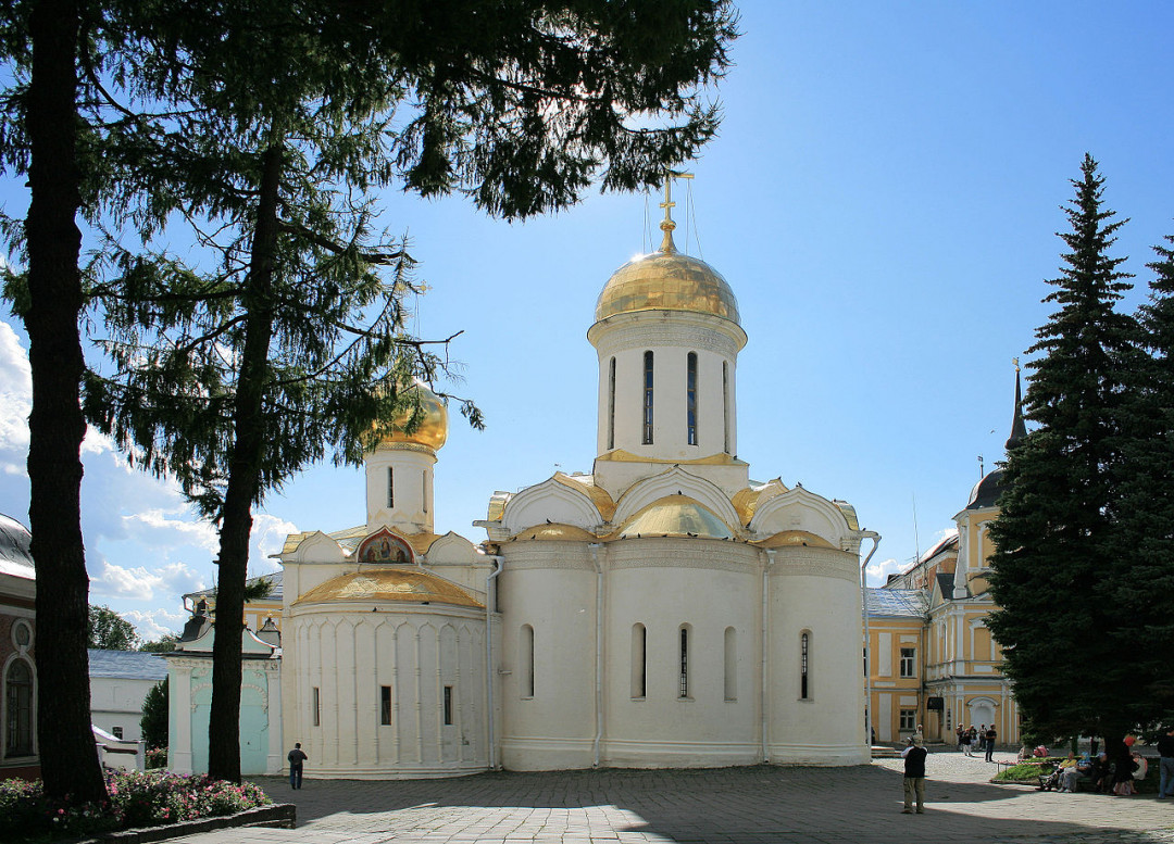 Троицкий собор — ровесник Лавры, он основан в 1423 году. Небольшие размеры и аскетичный внешний вид отличают этот храм раннего русского христианства от более поздних пышных церквей с позолоченными куполами. Внутри хранятся частицы мощей Сергия Радонежского. Наружные стены практически лишены украшений, только три каменные ленты опоясывают периметр. Узкие окна пропускают тусклый свет, который падает на фрески. В соборе можно увидеть прекрасно выполненный список с великой «Троицы» Андрея Рублева, которая писалась мастером именно в этих стенах.