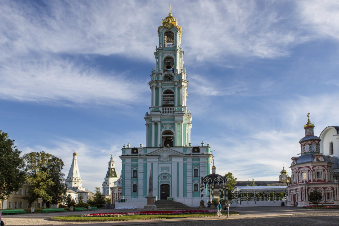 Колокольня Троице-Сергиевой Лавры на Соборной площади монастыря на 6 метров превосходит по высоте колокольню Ивана Великого в Кремле. Величественная постройка появилась в Лавре в 1770 году. Этому предшествовали три десятилетия строительства. Императрица Елизавета Петровна лично утверждала проект. На массивном постаменте решили возвести четыре уровня звонницы. Венчает колокольню необычный купол в виде золотой чаши с коронами. Колокола, отлитые для звонницы, в то время били все рекорды по весу, размерам и количеству. К началу XX века на разных ярусах находились 42 колокола. Сегодня их осталось 17, но и они наполняют город мелодичным перезвоном. Восстановленный в 2001 году «Царь-колокол» весит 72 тонны и является самым большим колоколом православных соборов мира.