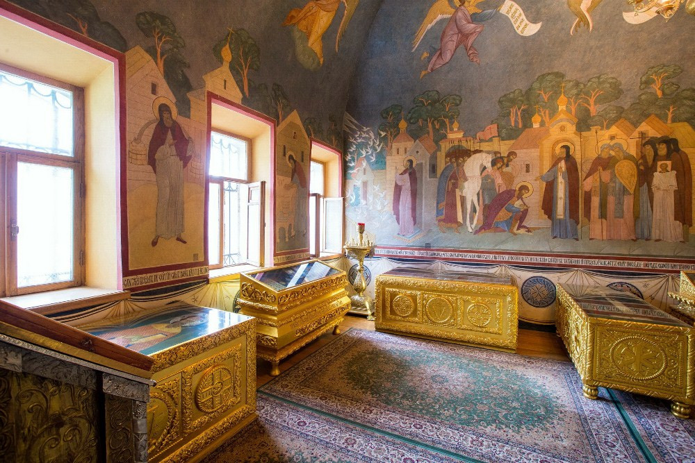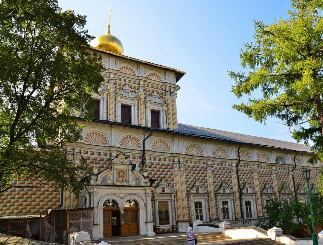 «Пёстрые хоромы» на территории Лавры — Царские чертоги, путевой дворец Алексея Михайловича. Были времена, когда обитель принимала одновременно до 500 человек царской семьи и придворных. Для них был построен великолепный дворец, выделяющийся на фоне строгой архитектуры старинных церквей. Здание составляет единый ансамбль с Трапезной. Шахматная раскраска «под руст» и линейка окон на протяжённом фасаде подчеркивают внушительные размеры дворца. Интерьер украшен старинными печными изразцами XVIII века, искусной лепкой и резьбой. На втором этаже особняка работает Музей церковно-археологического кабинета.