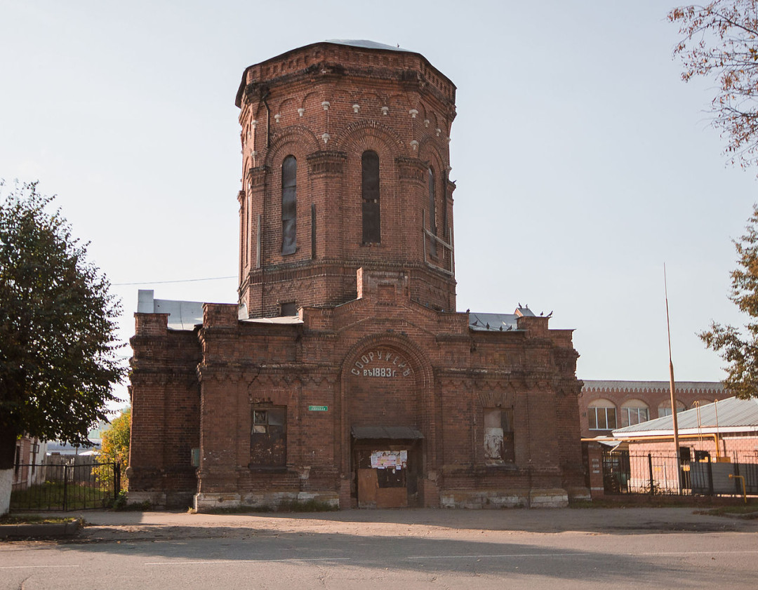 Шуйская водонапорная башня — шедевр промышленной архитектуры, созданный академиком и автором проекта Государственного исторического музея В. О. Шервудом. Во второй половине XIX века в Шуе провели противопожарный водопровод и на Базарной площади построили водонапорную башню. Сооружение в древнерусском стиле сложено из красного кирпича и щедро украшено рельефным декором. Высокий восьмерик башни стоит на одноэтажном здании крестообразной формы. На одном из фасадов в арочной нише выложена дата постройки — 1883 год. Внизу к стенам были пристроены поилки для лошадей, восьмигранные водоразборные колонки-башенки. До наших дней они не сохранились, как и шатровая крыша. Водонапорная башня давно выведена из эксплуатации и ожидает реставрации.