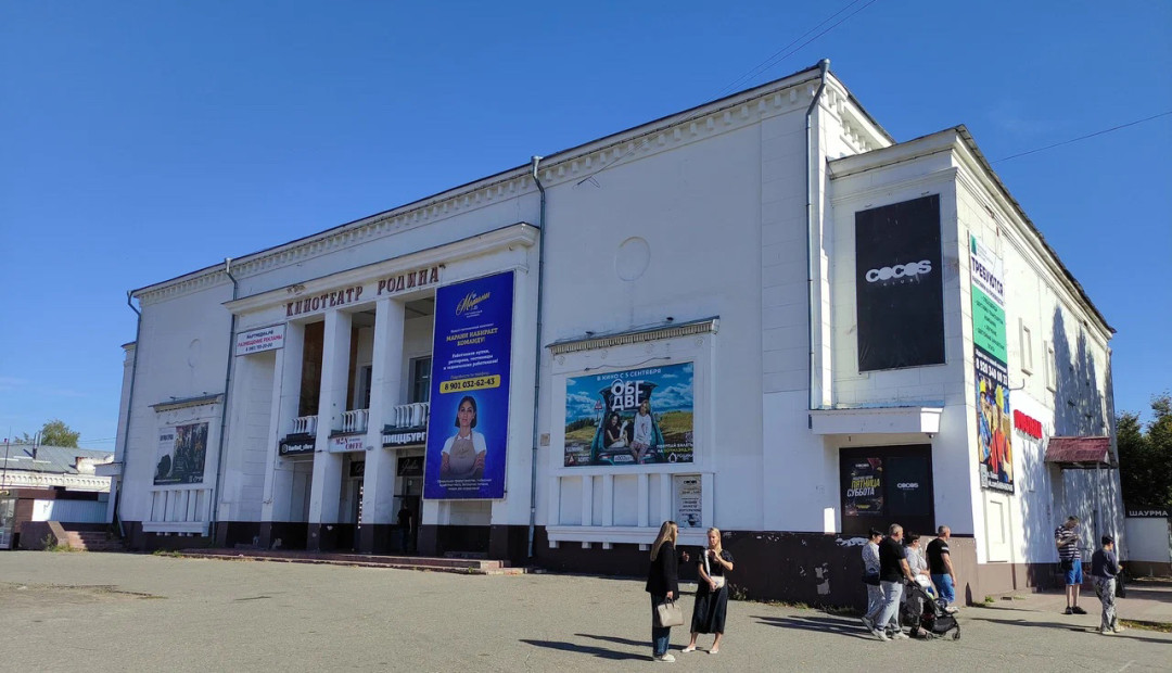 Монументальное здание шуйского кинотеатра «Родина» было построено в 1941 году и открылось для зрителей 1 января 1942-го. В то время кино показывали в двух залах. В наши дни здесь по-прежнему находится кинотеатр. Комфортабельный кинозал на 228 мест с love-зоной оснащён современной аппаратурой для показа фильмов в 3D-формате. В фойе работает кинобар с попкорном и напитками.
