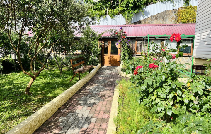 Экскурсия проходит в уютной беседке с кондиционерами, которая находится на территории цветущего сада и виноградника.