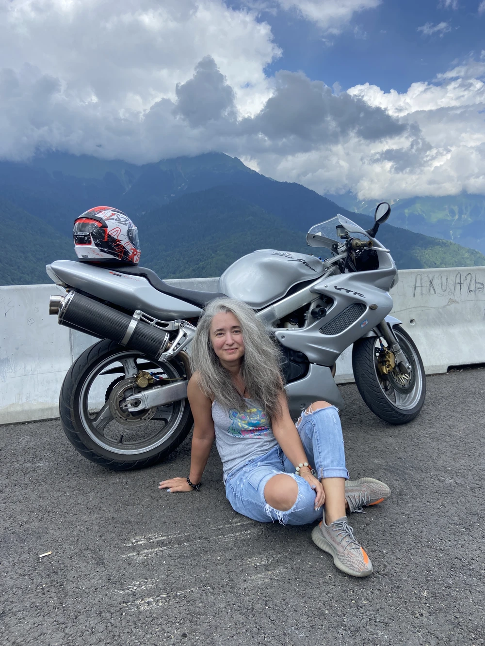 Остановимся на смотровой площадке с видами на вантовый мост и ущелье. Тут же сделаем ваши классные фото с мотоциклом.