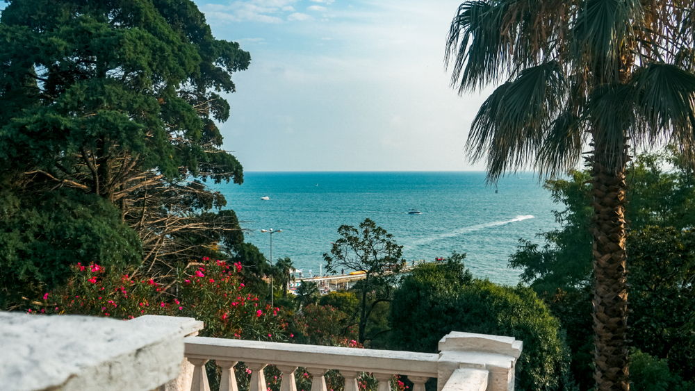 - Мимо фонтанов и концертного зала «Фестивальный» к смотровой площадке, спрятанной среди пицундских сосен.