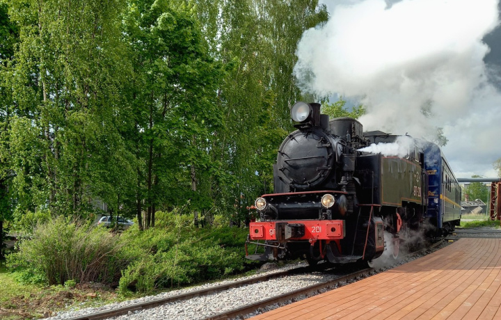Экскурсия начнётся на станции «Сортавала-центр». Мы посмотрим, как с громким гудком прибывает и отправляется в путь старинный паровоз, который идёт в горный парк «Рускеала». На вашем авто отправимся туда же.