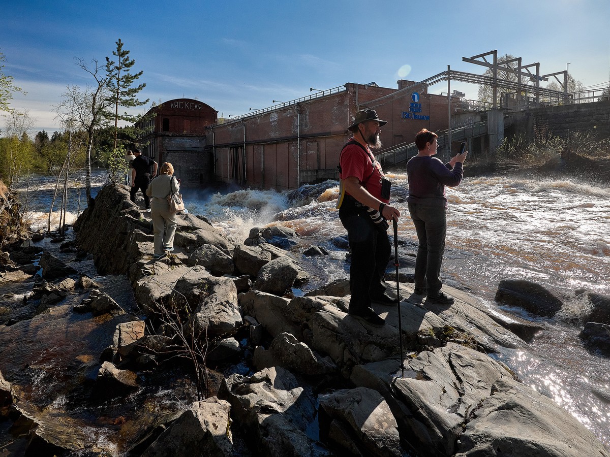 Остатки финской плотины образовали каскад: вода скатывается по скальному желобу, словно с горки.