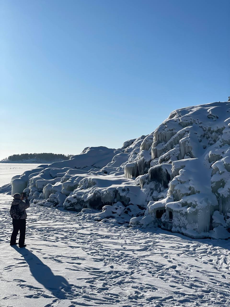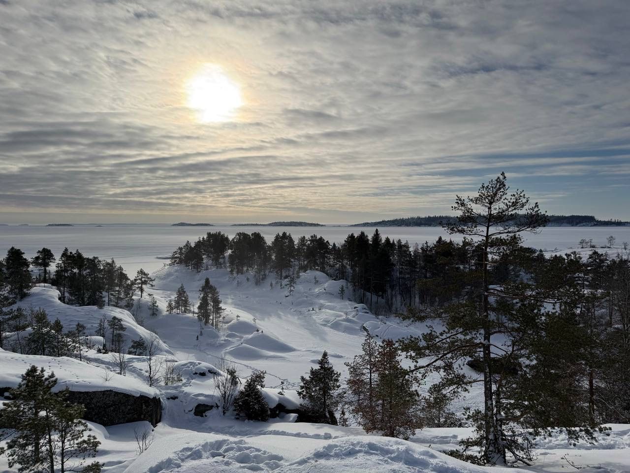 Первой нашей остановкой станут Ладожские шхеры. Это скалистые островки, которые отделены друг от друга проливами. С наступлением холодов это место кардинально преображается. Белоснежные снег и темные угрюмые скалы создают неповторимые пейзажи.