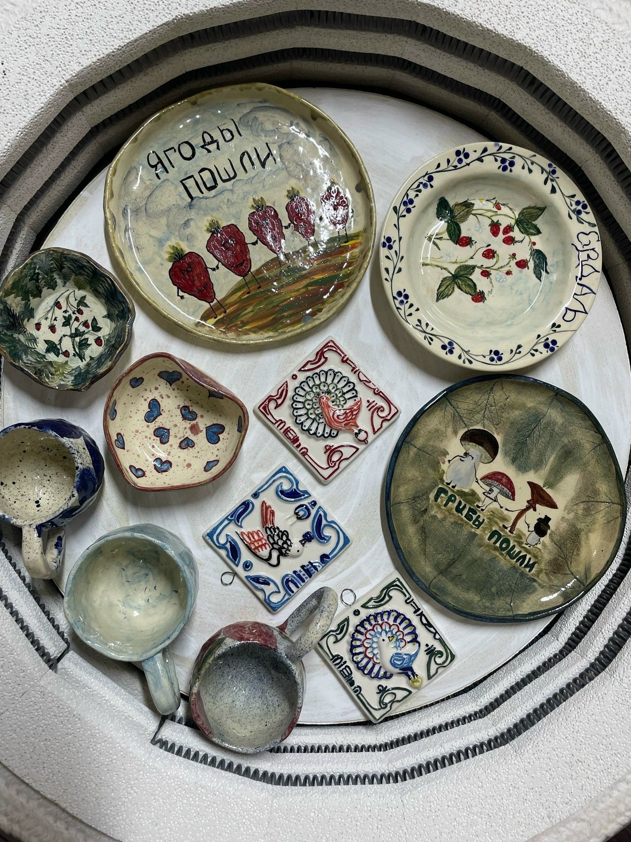 Вы сделаете то, что захотите сами — кружку, тарелку, вазу или игрушку. Мы будем рядом и поможем на каждом этапе. Вы распишете изделие ангобами (особые краски) на свой вкус и оставите его нам на обжиг и глазурование. В течение месяца ваш шедевр будет готов отправиться к вам домой.