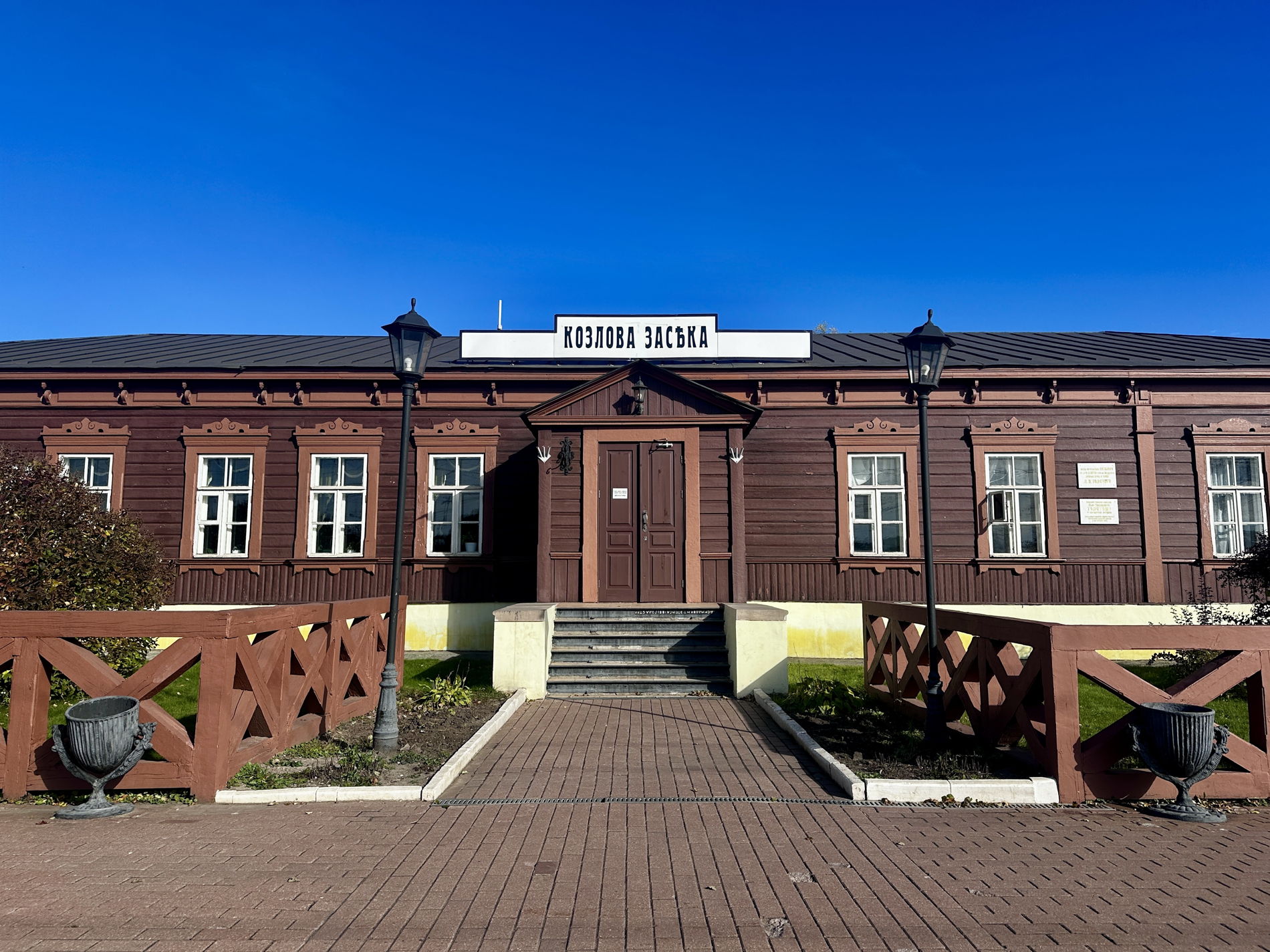 Музей вокзал «Козлова Засека». Небольшая станция в нескольких километрах от усадьбы. Здесь вы увидите: отреставрированное деревянное здание станции; деревянные скамейки, кассы, старые таблички; часы, навсегда застывшие на 6:30 — времени прибытия траурного поезда с телом Толстого в ноябре 1910 года.