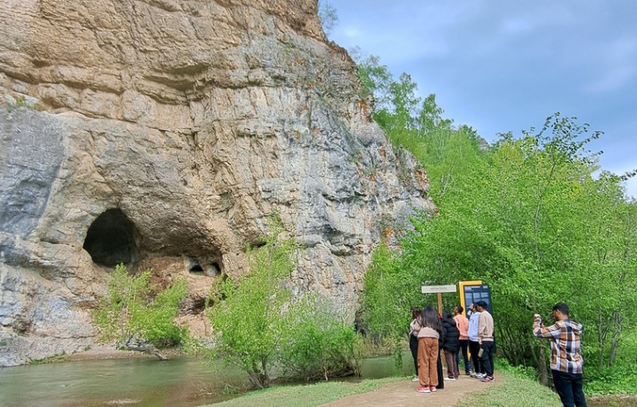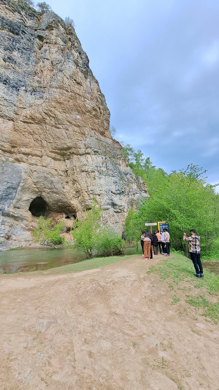 Начнём маршрут с одной из самых эффектных скал региона. Вы подниметесь к смотровой площадке и увидите пещеру, связанную с именем Салавата Юлаева. Летом можно забраться внутрь.