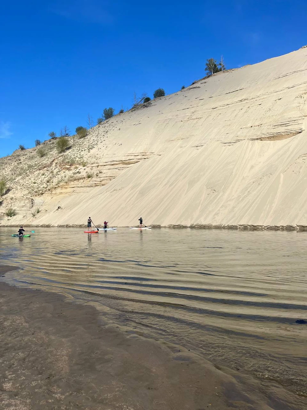 Вы подниметесь на дюну, откуда открывается вид на зелёные луга и петляющую между ними голубую реку.