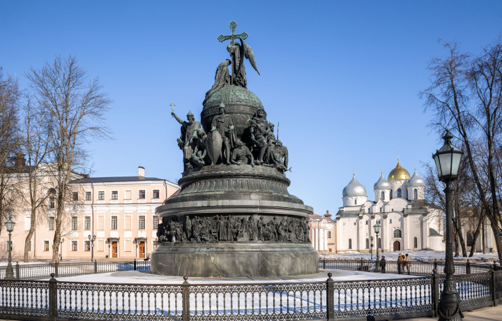 Памятник «Тысячелетие России» открыт во второй половине XIX столетия. Создание монумента было приурочено к празднованию 1000-летия Российской государственности. Композиция представляет собой основные символы — вечевой колокол и шар-державу. Визуально памятник делится на три уровня. На фризе первого яруса изображено 129 фигур — просветители, государственные люди, воины, герои, писатели и художники.