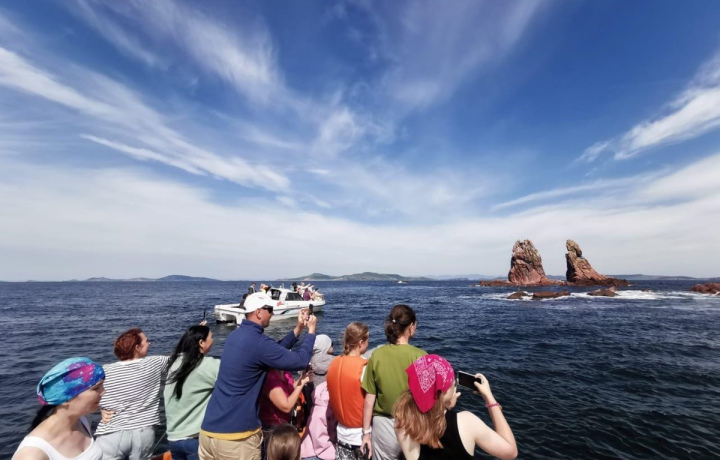 Таинственный грот Тобизина — конечно, посетим самое живописное место острова Русский. Доберёмся на катере к скалистому гроту, чтобы насладиться бирюзовой водой в обрамлении древних скал. А затем, напротив, с суши полюбуемся пейзажами Японского моря.