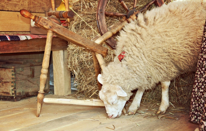 Мы сначала покормили и погладили овечку, потом немного состригли с неё шерсти для нашего урока, затем эту шесть приготовили для прядения и только после этого подошли к прялке.