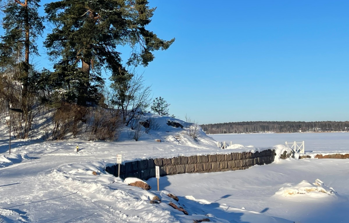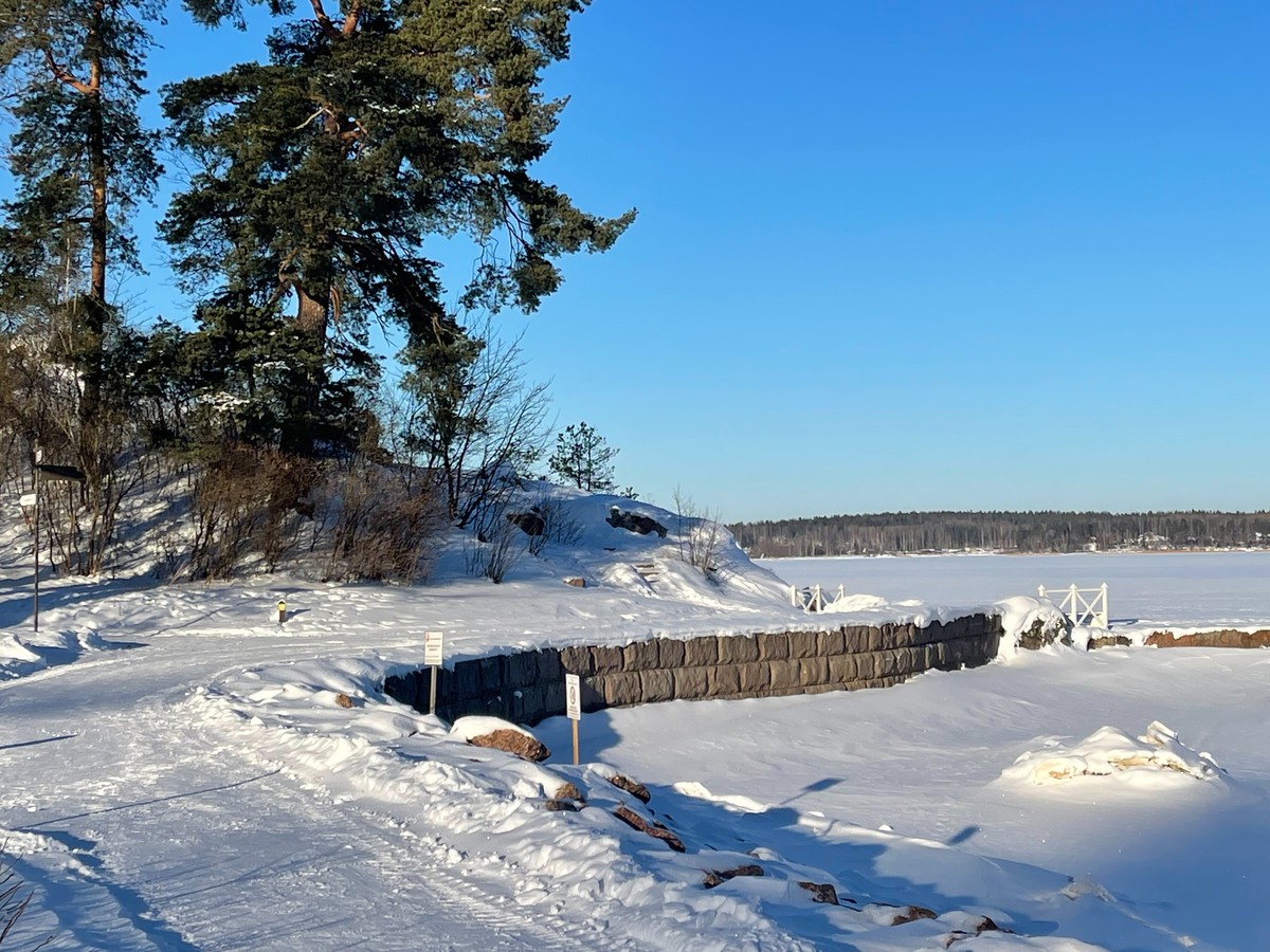 Дойдём до ущелья со скульптурой Вяйнямёйнена — героя карело-финского эпоса Калевала. А в финале вы увидите локацию, которую местные называют «Концом света» — здесь парк словно обрывается в простор залива.