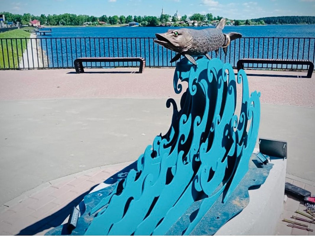 Вдоль променада стоят скамейки, на смотровой площадке появился бинокль. Выксунские предприниматели сделали приятный подарок горожанам. По их инициативе на набережной установлен первый арт-объект — щука, выплывающая на гребне волны.
